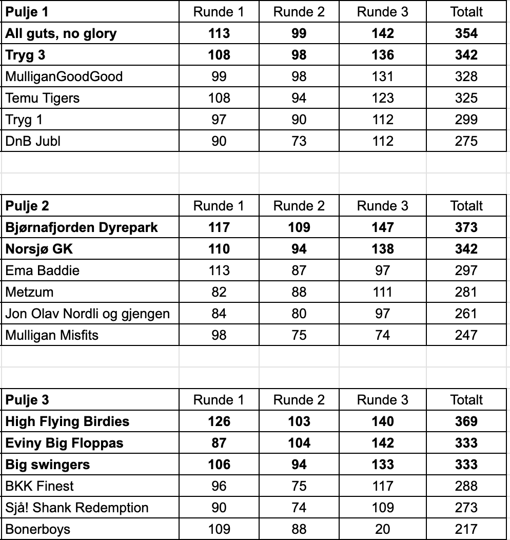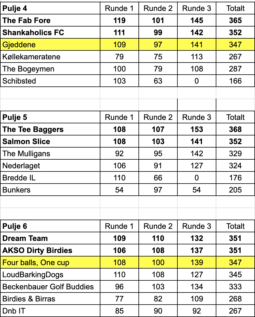 – Beste treer går også til semifinale. Her ble det delt på 347 poeng, så både Gjeddene og Four balls, one cup går til semifinale.